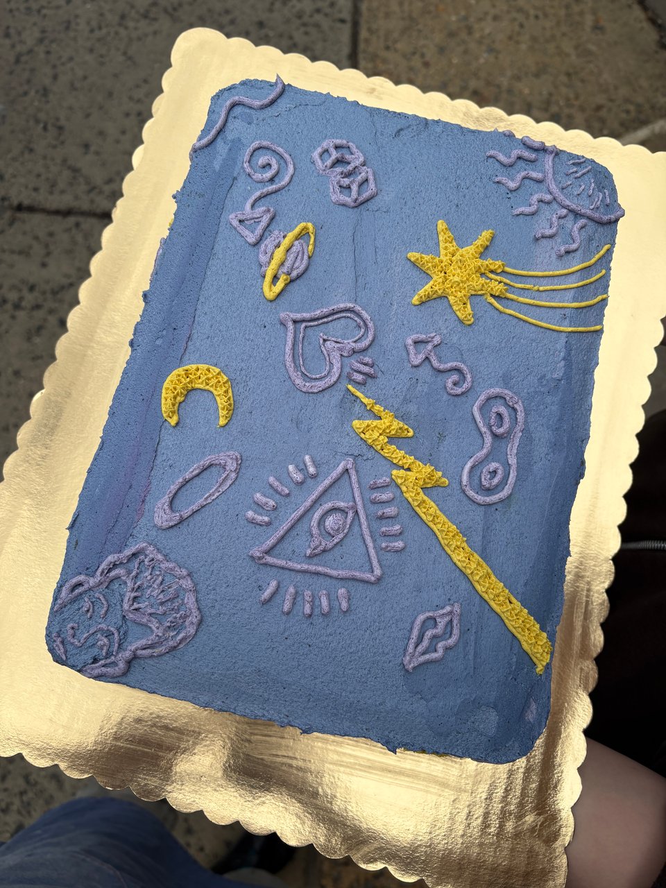 What I came up with is a menu of five baked goods that take inspiration from five women artists, all whose work is currently in the PMA’s collection: Betye Saar, Ana Mendieta, Louise Bourgeois, Reiko Sudo, and Elsa Schiaparelli. We’ll have two kinds of cookies, one glorious sheet cake, very special sourdough soft pretzels, and cucumber finger sandwiches to sell and share at the party. Julia, our wunderkind artist and cake decorator, is showcasing her skills on this Betye Saar-inspired cake. I mean would you look at this!