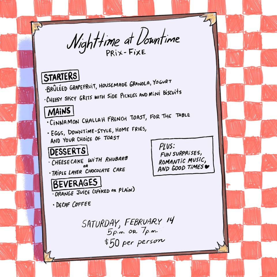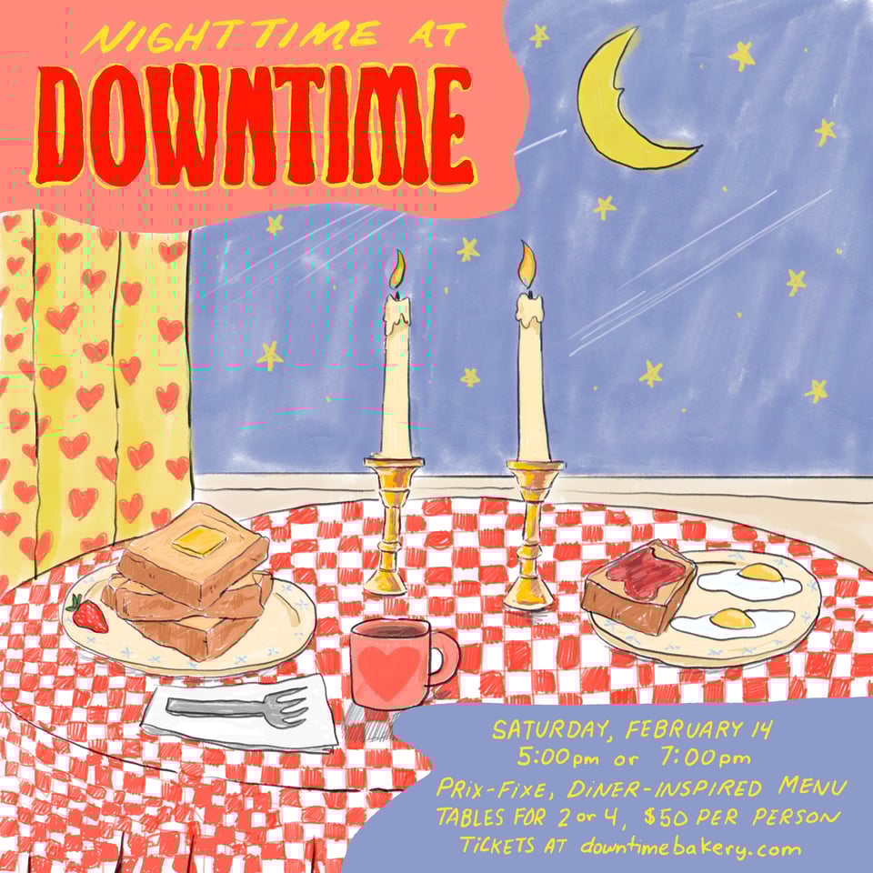 We 💘 breakfast for dinner, so we're turning the bakery into a full-service nighttime diner, for one night only, on Valentine’s Day. We've concocted a prix-fixe menu with all of our favorite diner foods, plus decaf coffee and spiked or plain orange juice for all.
